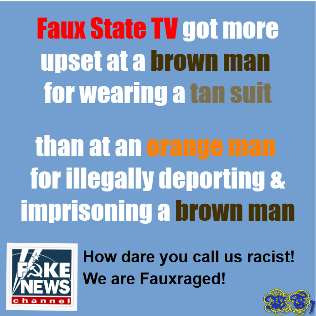 Faux State TV got more upset at a brown man for wearing a tan suit than at an orange man for illegally deporting & imprisoning a brown man FAKE NEWS label: How dare you call us racist! We are Fauxraged! -WT7