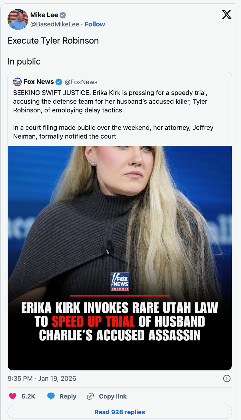 Asshole Utah Senator Mike Lee advocating on X for Tyler Robinson (aleged Charlie Kirk kmurdurer) to be executed.