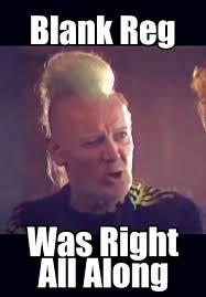 An image of Blank Reg from the Max Headroom TV series - a late middle aged stylized punk rocker with a silvery mohawk hairstyle. Large text framing says "Blank Reg Was Right All Along"
