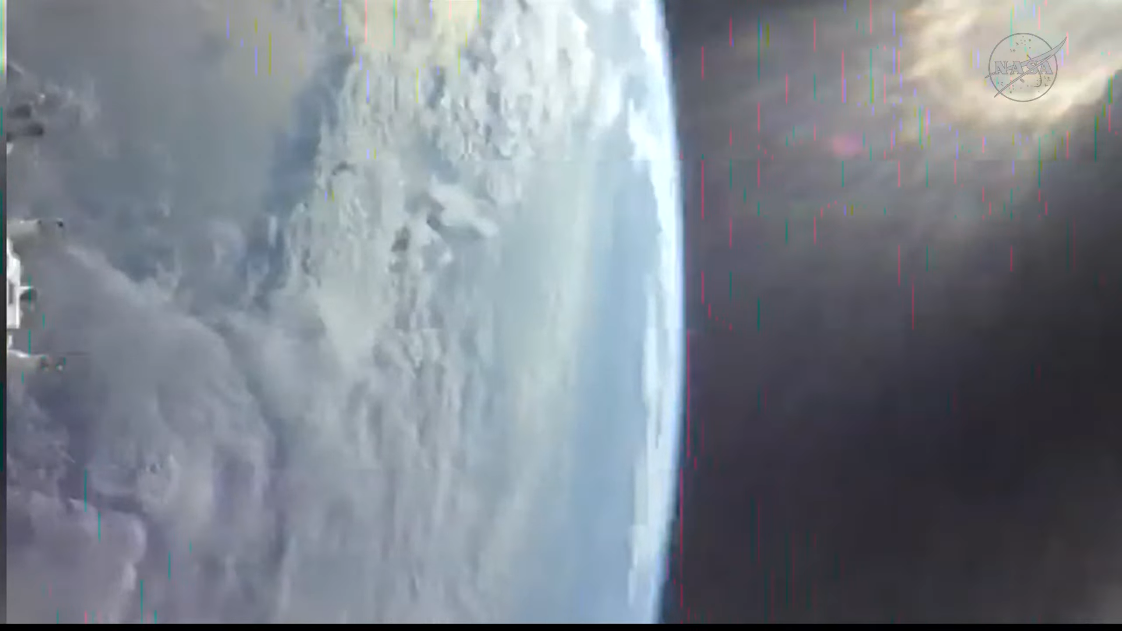 The Sun is behind the Earth, illuminating a thin crescent. This low-light shot, taken by Reid Wiseman using a Nikon D5, shows auroras over the poles, city lights, and the glow of the atmosphere.