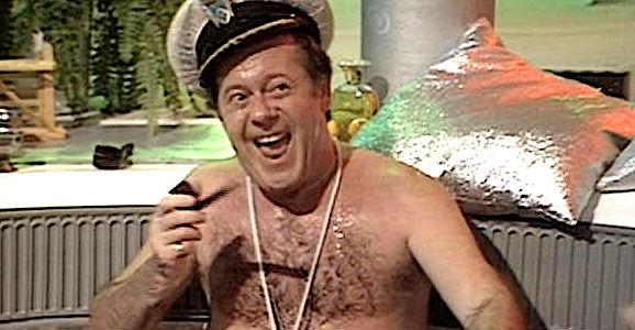 Golgafrincham captain relaxing in hot tub, smiling, while smoking his pipe. He's human in appearance and is wearing a ship's captains hat. Golgafrinchams were characters in the BBCs production of Hitchhiker's Guide to the Galaxy which was based upon the book by Douglas Adams.