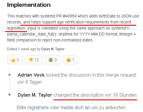 The discussion about age verification in systemd / Linux was locked. But the description of the merge request can be changed ...