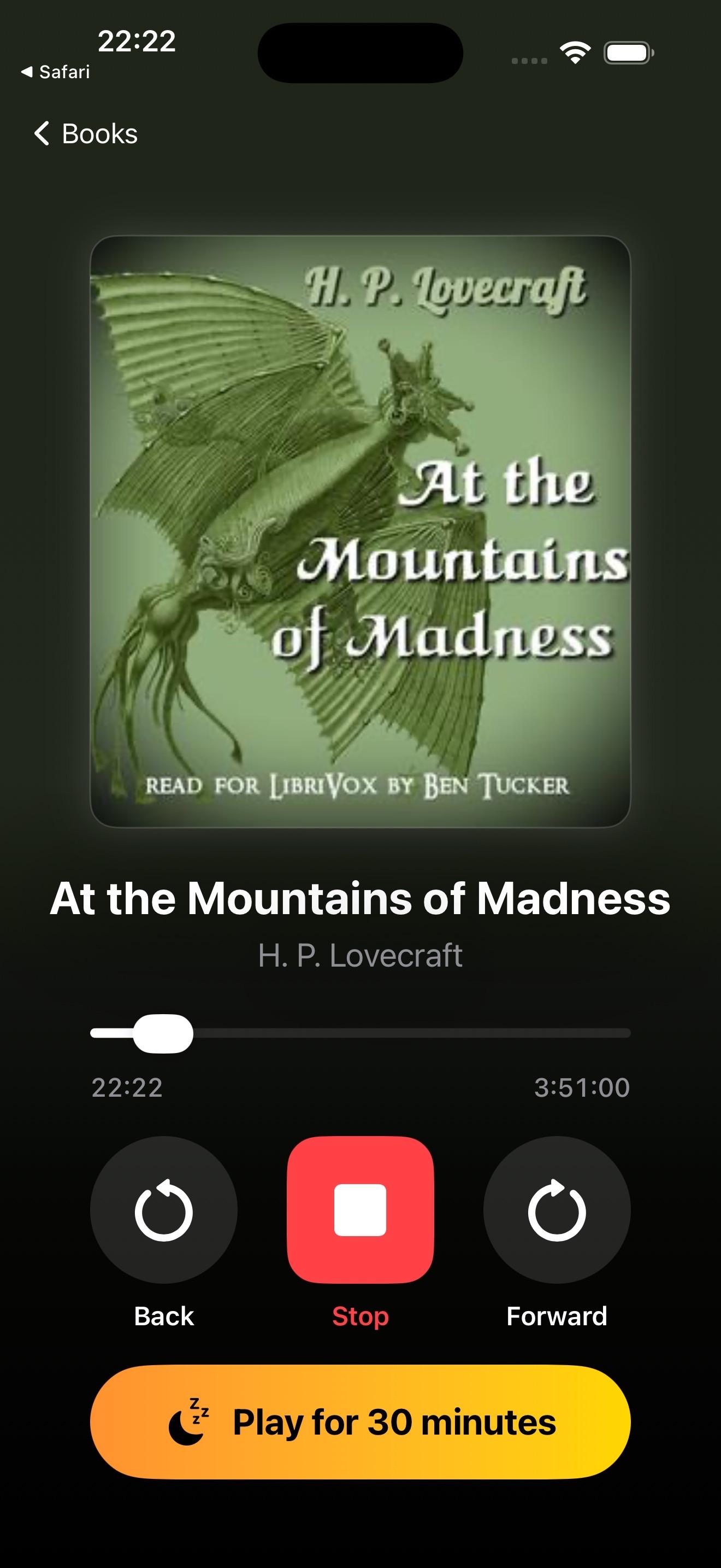 An audio playback screen displaying "At the Mountains of Madness" by H.P. Lovecraft. The background is green with an illustration of a creature resembling a flying monster. The display is large and bright.