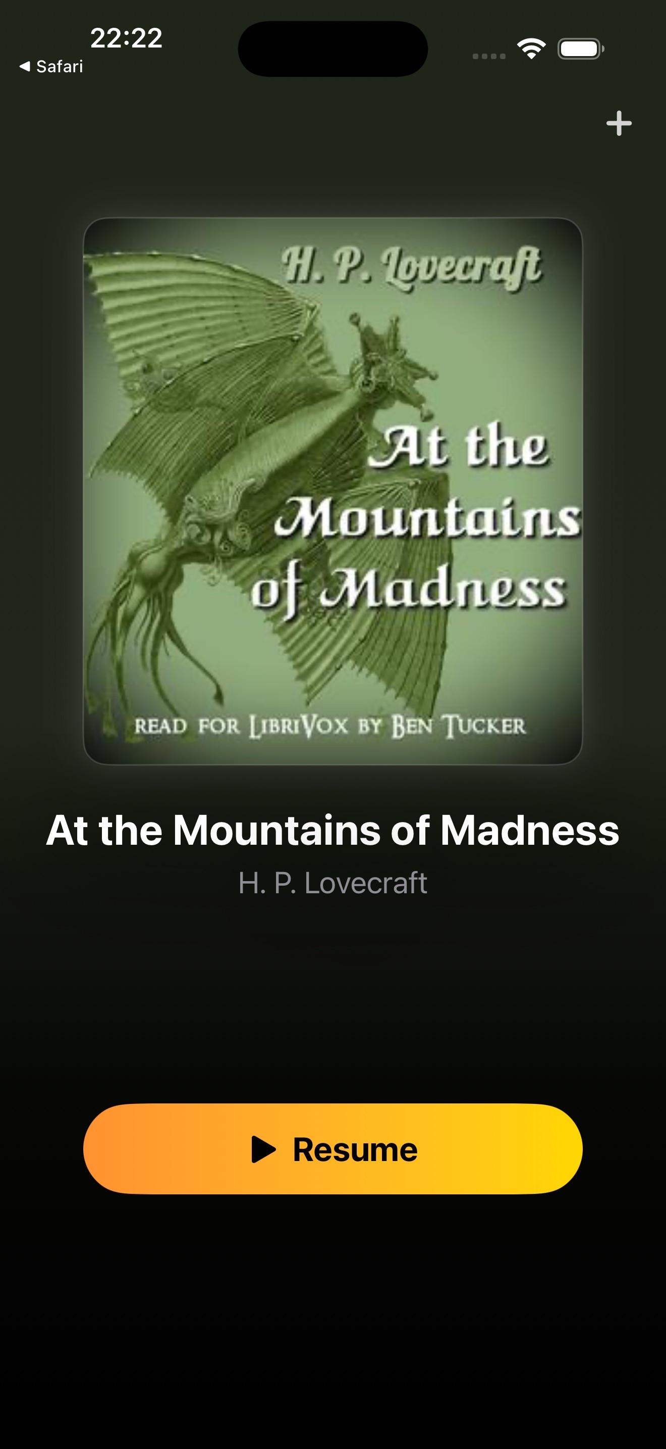 The image features the audiobook cover of "At the Mountains of Madness" by H.P. Lovecraft. It has a green background with a fantastical creature illustrated, along with the title and author’s name prominently displayed. A "Resume" button is prominently placed below.