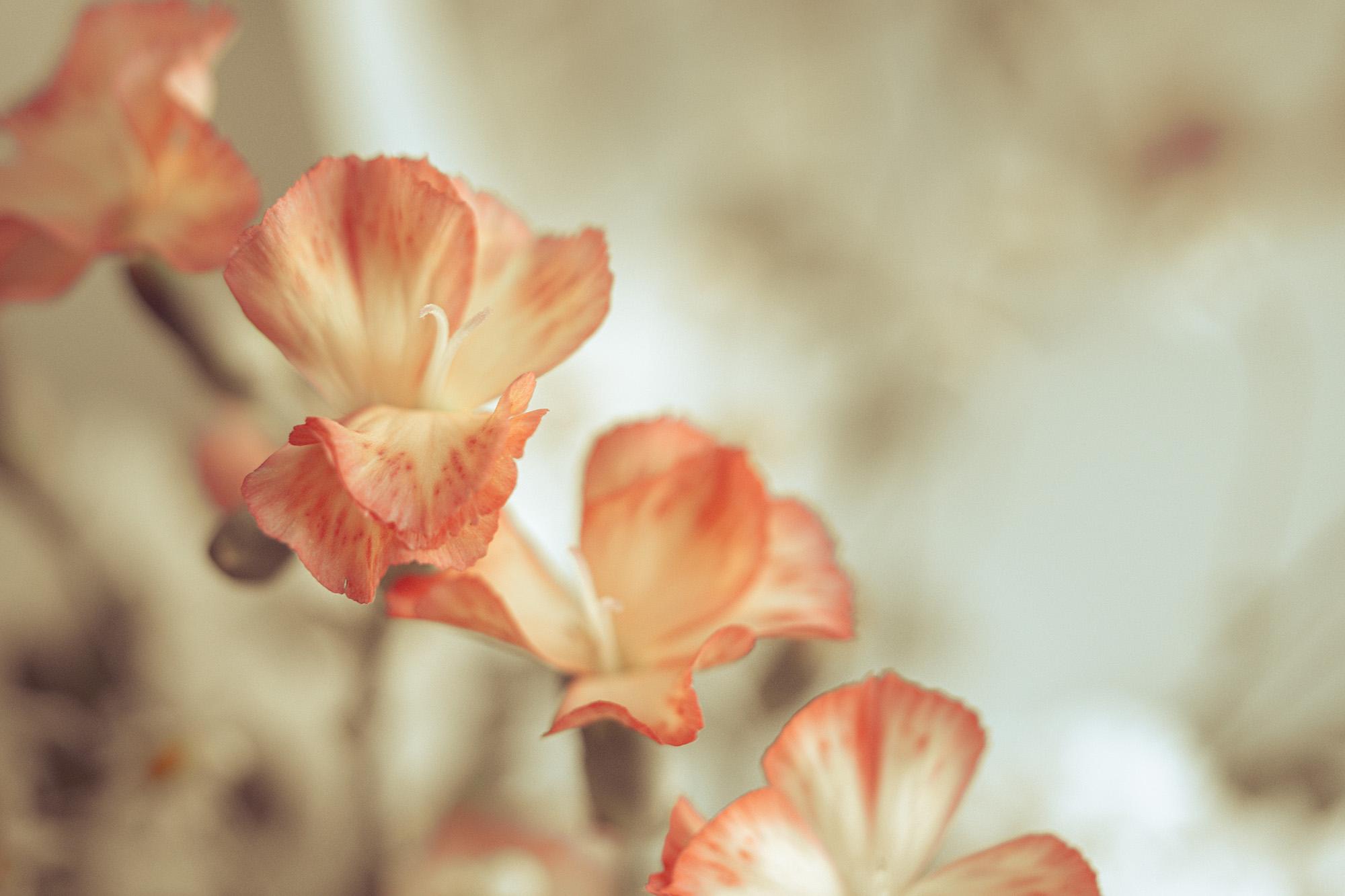 A macro close-up of carnation flowers. The form a diagonal line from the top left to the bottom right, cutting through the image with a bright background right behind them. The colouring on the image is subdued. I'm playing with a palette that reminds me of old paintings