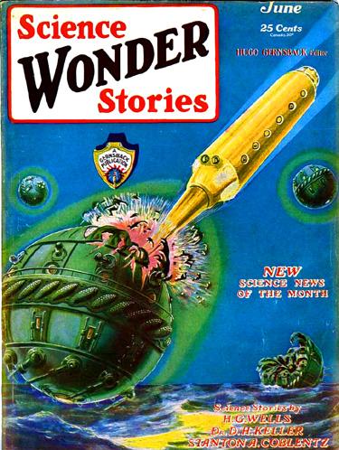 Science Wonder Quarterly, Winter 1930. Spherical spaceship suits a long tube spaceship. They appear to be on a planet or moon close to Earth (in the distance).